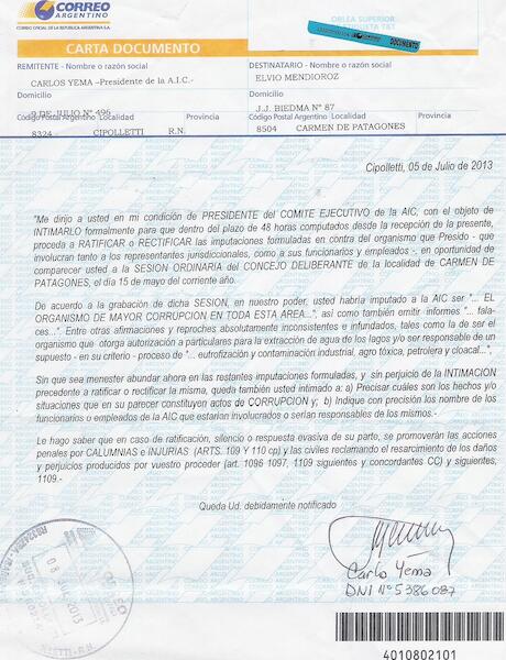 Conforme al tema de referencia, adjunto a ustedes el archivo “Agua fracking Carta Documento de la AIC 12/072013”, en la cual se me intima a ratificar o rectificar mis declaraciones en el marco del Honorable Concejo Deliberante de Patagones, vinculados con mis dichos sobre la provisión de agua de la cuenca del río Negro a contaminar por su provisión al yacimiento hidrocarburífero de Vaca Muerta en Neuquén, discurso que los concejales me dieran paso a referir sobre la eutrofización y contaminación cloacal, industrial, agroquímica y petrolera de nuestra cuenca, y la responsabilidad de la Autoridad Interjurisdiccional de las Cuencas de los ríos Limay, Neuquén y Negro AIC al respecto de ambas situaciones. Ver aquí