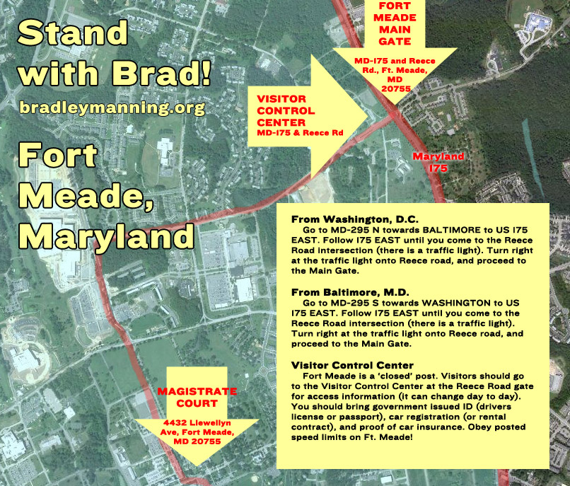 The first day that court is in session each week of the trial, we hold a vigil from 7:00 am to 8:30 am in front of the Fort Meade Main Gate at Reece Road and US 175 (Google map). Afterwards, we enter Fort Meade (via the Visitor Control Center), and go to the courtroom. E-mail emma@bradleymanning.org for vigil updates. On other days, we recommend arriving at the base at 8:30am in order to leave time to clear security before court begins at 9:30am. However, if you arrive later you’ll still be able to enter at a court recess.