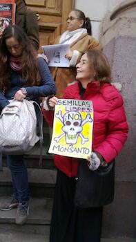 Frente a la puerta de ingreso ubicada en Morandé, los manifestantes instalaron el pendón de la campaña Yo No Quiero Transgénicos, sostenido por Guillermo Riveros, presidente de los agricultores orgánicos de la REgión del BIoBio, y corearon consignas sobre sus negativos impactos. "Ya van a ver, ya van a ver, cuando sin semillas no tengan qué comer"; o "Senado, escucha, la semilla está en la lucha"; "No queremos, no nos interesa tener a Monsanto sentado en nuestra mesa".