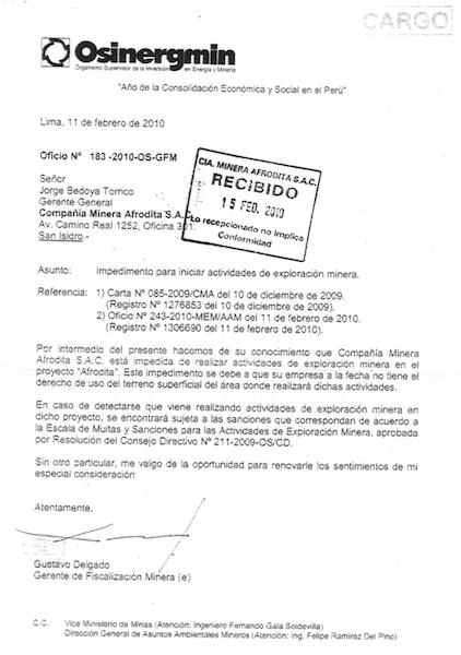Es evidente, que la gran mayoría de comunidades se oponen a la empresa minera Afrodita. Es más, la propia OSINERGMIN ha reconocido que la empresa Afrodita no cuenta con el derecho del uso del terreno superficial donde realiza la exploración, y por ende, está impedida. Sin embargo, ninguna autoridad hacer valer la ley, en este caso particular, sancionar a Afrodita por no cumplir el impedimento interpuesto por OSINERGMIN.