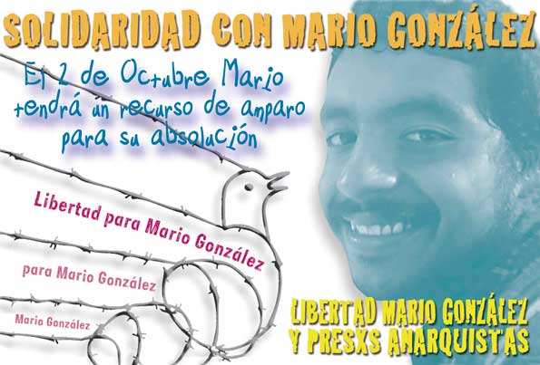 Nos ponemos en contacto con ustedes, ustedas y ustedos, porque desde México nos llega un reclamo de solidaridad para el compañero anarquista Mario González, detenido el año pasado (2013) cuando iba en un camión (autobús) a una protesta estudiantil, y que actualmente se encuentra en prisión condenado sin ningún tipo de pruebas, sólo con la intención de imponer el estado de miedo a lxs estudiantes en general que estaban en pie de lucha y en particular a todo el movimiento anarquista que ha venido siendo criminalizado, muy especialmente, desde la toma de poder del actual presidente Peña Nieto (1 Diciembre 2012).