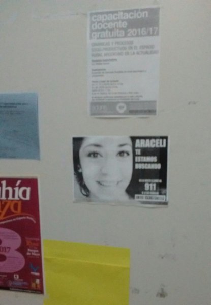 fotos de su acción. Aquí, una selección: La actriz Dolores FonziEl equipo periodístico de Crónica TVEn el Instituto Nacional de Arte de Avellaneda.En Plaza de Mayo, frente a la Casa RosadaEn la avenida Juan B. JustoEn la estación ConstituciónEl director de cine Santiago MitreEn el INADIAl lado de MicaelaCon Marita VerónEn la secretaría académica de la Universidad de Buenos Aires (UBA)En el Congreso de la NaciónEn el Ministerio de TrabajoEn las publicidades callejerasEn los bancosEn la estación Darío y MaxiEn los kioscos de venta de diarios y revistasEn la casa de las Madres de Plaza de MayoEn la estación de trenes de HurlighamEn el estadio de fútbolEn los comercios abiertosEn los comercios cerradosEn la Facultad de Sociales de la UBAEn una librería de PalermoEn el subteEn la redacción del diario Tiempo ArgentinoEn una oficina de la tarjeta de crédito VISAEn una oficina de una empresa de agronegociosEn la Facultad de Derecho de TucumánEn la Universidad de Bahía BlancaEn la Universidad de Ciencias Económicas de CórdobaEn la Universidad Nacional de ArteEn las oficinas de ENACOMEn la estación de trenes de PalermoEn el kiosco de diarios de la estación Castro BarrosEn una unidad básicaEn la Avenida 9 de JulioEn la parada del colectivoEn las publicidadesEn los cestos de basuraEn las puertasEn la oficina de la municipalidad de HurlinghamEn el vagón del trenEn avenida Callaovía: http://www.lavaca.org/notas/el-estado-no-se-mueve-la-sociedad-si-araceliteestamosbuscando/