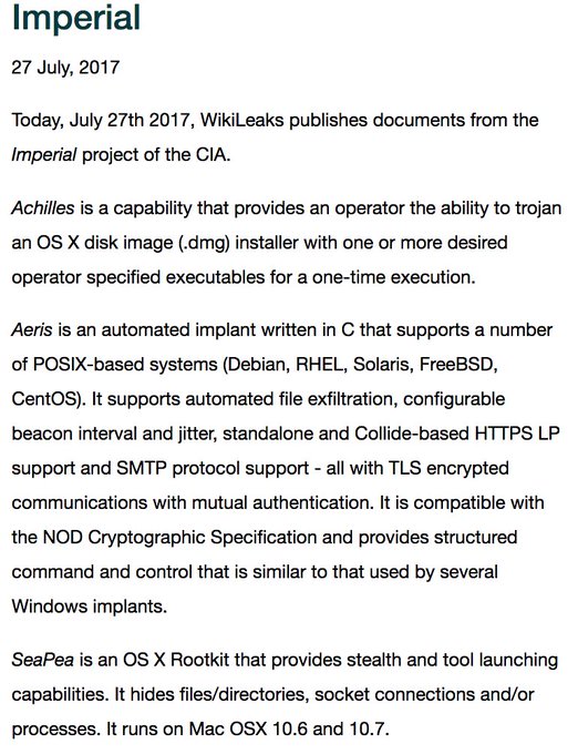 RELEASE: CIA project 'Imperial'. Trojans targeting Macs, Debian, Red Hat, Solaris, FreeBSD, Centos # Vault7 # Imperial https:// wikileaks.org/vault7/release s/#Imperial …